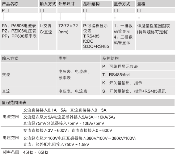 例 1 、如客戶需要直流電流表,產(chǎn)品名稱為電流表,輸入方式為直流,外形尺寸為 48 × 96, 品種結(jié) 構(gòu)可編程顯示儀表,顯示方式為一排數(shù)碼管顯示,量程為 DC100A/75mV 則相對應(yīng)的訂貨編碼 為: PA606C-48P1 DC100A/75mV 。