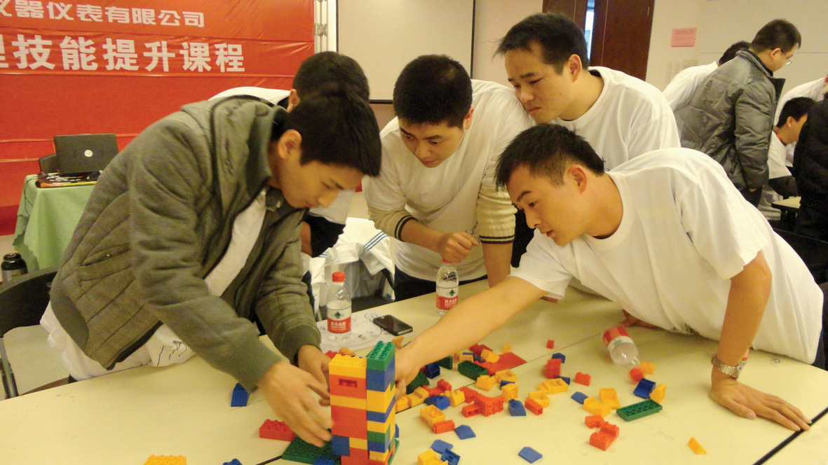 接下來的“溝通金字塔”項目模擬再現(xiàn)工作中存在的溝通困境,要求每隊在規(guī)定的時間內(nèi),建一座符合要求的塔,隊員之間不得有語言溝通。每隊選定項目管理者、操作者、信息員各一名。比賽開始,三支隊你追我趕,笑料百出?!皽贤牎钡墓芾碚哂靡粋€指頭示意領取材料“搭建第一層樓”。信息傳到操作者后,只見他一上場就抓積木,被教官責令全組停止作業(yè)兩分鐘?!白吭疥牎痹诒荣愔幸获R當先,保持著領先,眼看勝券在握,他們卻推倒了積木重來。原來,中途出了差錯。在摸索中,“溝通隊”發(fā)現(xiàn)手把手地“溝通”是最有效快捷的方式,在停賽兩分鐘的不利情況下,他們?nèi)月氏却罱ㄍ瓿伞?br /> “急速60秒” 項目是在一個繩圈中反放30張代表1—30的數(shù)字信息卡片,卡片正面是數(shù)字,背面是一些圖案。要求團隊在三分鐘內(nèi)通過圖案識數(shù)字,然后從1到30排序收集起來。為了盡快完成任務,三個團隊分工合作,兩分鐘內(nèi)大致摸清了圖案所代表的數(shù)字。接下來就是怎樣在60秒內(nèi)把這30張卡片找出并按順序交到教官手中。通過探討和試驗,“卓越隊”靈機一動:規(guī)則規(guī)定其他學員不能碰繩圈內(nèi)的卡片,不代表不能碰繩圈外的卡片,由繩圈內(nèi)的學員把卡片拿到繩圈外讓其他學員一起找尋大大提高了效率。最后,“溝通隊”用“統(tǒng)籌”方法率先完成任務。