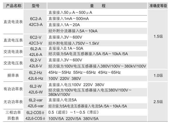 訂貨示例:備注:直流電流表中,6C2型與42C3型的直接接入電流范圍為1A~20A,