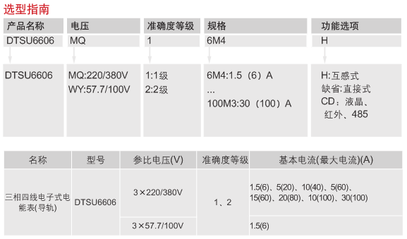 電流規(guī)格為1.5(6)A,功能選項(xiàng)為互感式,則相對(duì)應(yīng)的訂貨編碼為DTSU6606MQ16M4HCD
