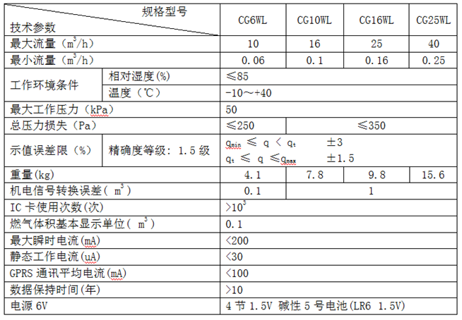 CG6WL/CG10WL/CG16WL/CG25WL 無線遠(yuǎn)傳膜式燃?xì)獗硎且阅な饺細(xì)獗頌橛嬃炕?加裝流量信號采集模塊、GPRS無線傳輸模塊、IC卡模塊、閥門控制模塊及電源管理模塊等所組成的新型智能燃?xì)獗怼T摫沓哂忻簹?、天然氣、液化石油氣等燃?xì)獾捏w積計量功能外,還具有計量數(shù)據(jù)機(jī)電轉(zhuǎn)換、無線數(shù)據(jù)傳輸、閥門遙控等功能。技術(shù)指標(biāo)符合GB/T 6968 《膜式燃?xì)獗怼?,JJG 577 《膜式燃?xì)獗怼贰?br />