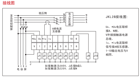 如客戶需要JKL2B型智能無功功率自動補償控制器,工作電壓為220V,規(guī)格為4回路,輸出電壓為常規(guī),則相對應(yīng)的訂貨編碼為:JKL2BM10