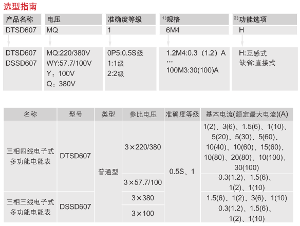 如客戶需要DTSD607型三相四線電子式多功能電能表,電壓為3×220/380V,準確度等級為1級,