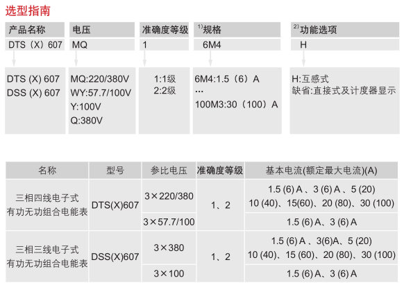 如客戶需要三相四線電子式有功無(wú)功組合電能表,電壓為220V,準(zhǔn)確度等級(jí)為1,電流為1.5(6)A,功能選項(xiàng)為互感式,則相對(duì)應(yīng)的訂貨編碼為:DTS(X)6074MQ16M4H